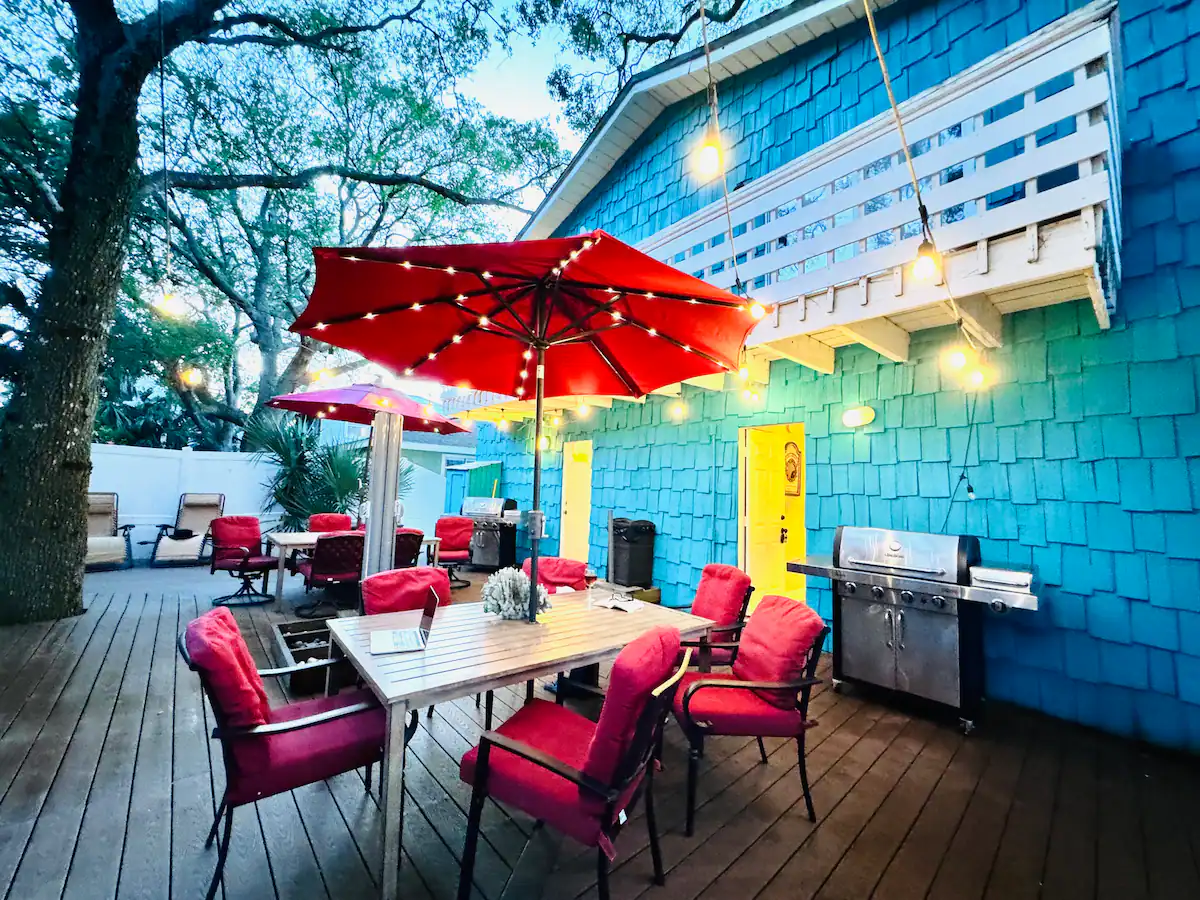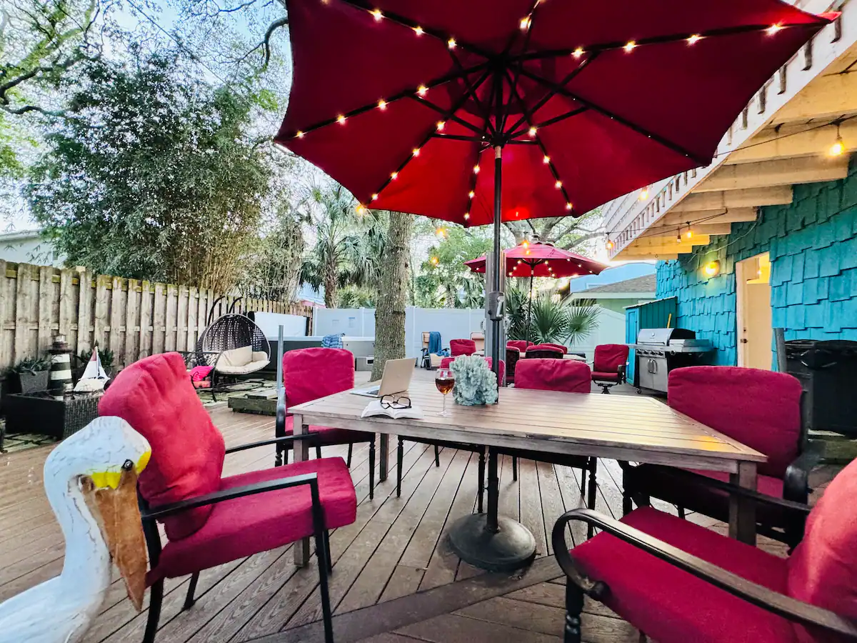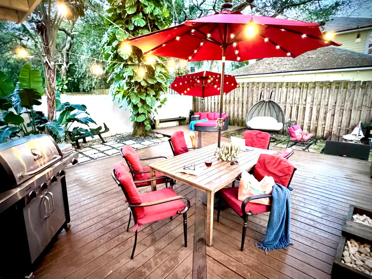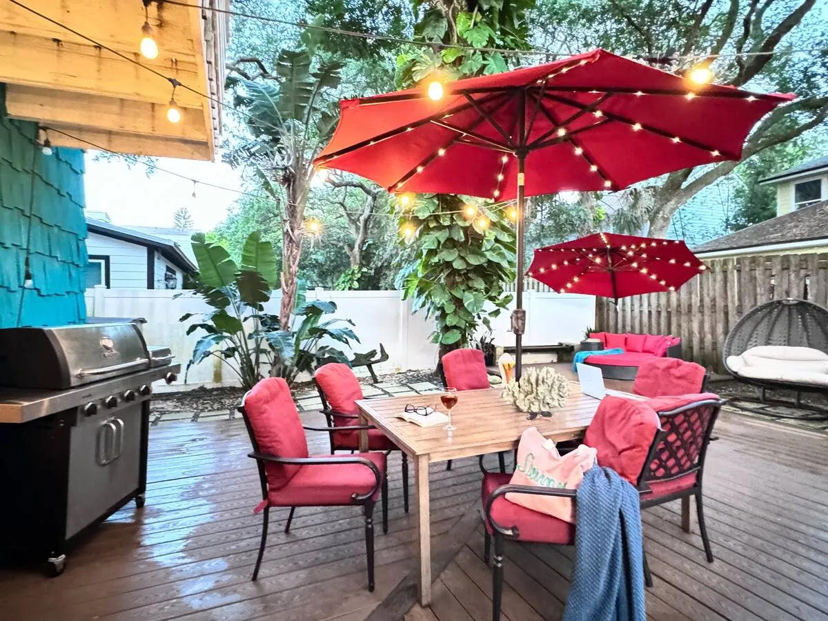 With convenient beach access, the ocean and its majestic sunrises are calling. It’s just a short 5 minute stroll (2 blocks) on a private sidewalk to reach the natural, sea-oat dunes and out onto the white, sandy St Augustine Beach. Go for a couple’s bike ride with one of our available bicycles. Come home to wash off in our private outdoor shower and enjoy the peace and quiet in our relaxing backyard that features multiple organic benches, swinging egg pods, zero gravity sun chairs, an umbrella covered lounge, hammock, an 1100 sqft deck and a relaxing hot tub. Enjoy the dozens of highly rated restaurants that are within walking distance or fire up one of our tasty grills and enjoy the covered dining set in the private back patio.