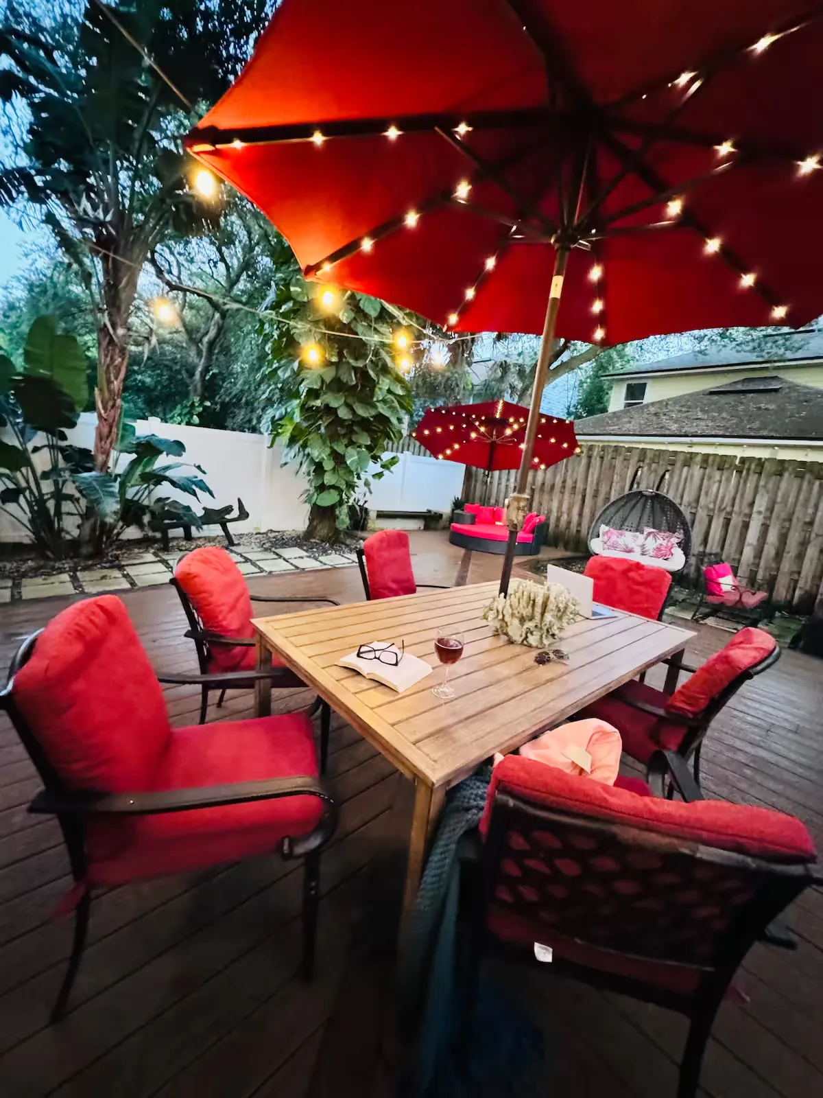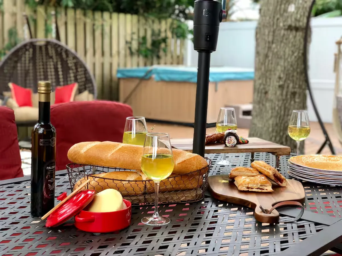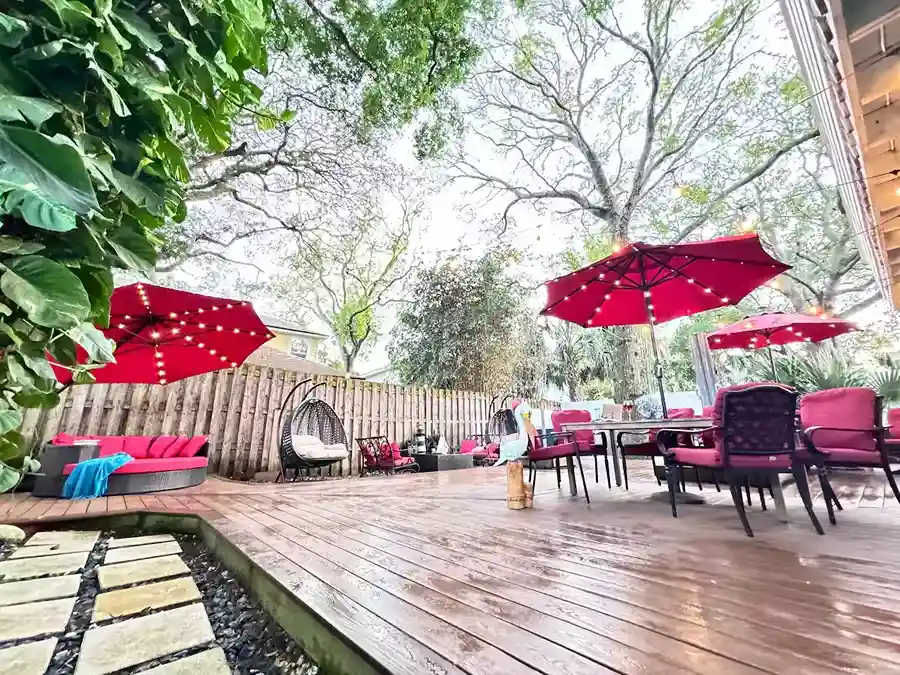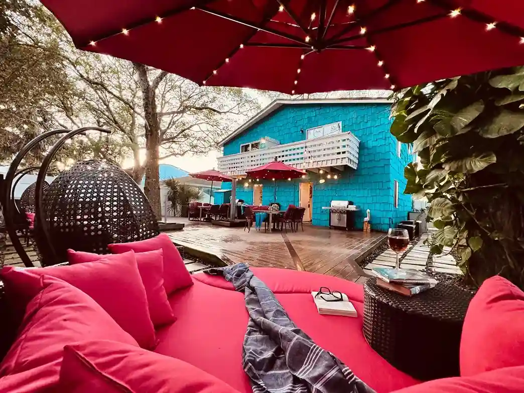 With convenient beach access, the ocean and its majestic sunrises are calling. It’s just a short 5 minute stroll (2 blocks) on a private sidewalk to reach the natural, sea-oat dunes and out onto the white, sandy St Augustine Beach. Go for a couple’s bike ride with one of our available bicycles. Come home to wash off in our private outdoor shower and enjoy the peace and quiet in our relaxing backyard that features multiple organic benches, swinging egg pods, zero gravity sun chairs, an umbrella covered lounge, hammock, an 1100 sqft deck and a relaxing hot tub. Enjoy the dozens of highly rated restaurants that are within walking distance or fire up one of our tasty grills and enjoy the covered dining set in the private back patio.