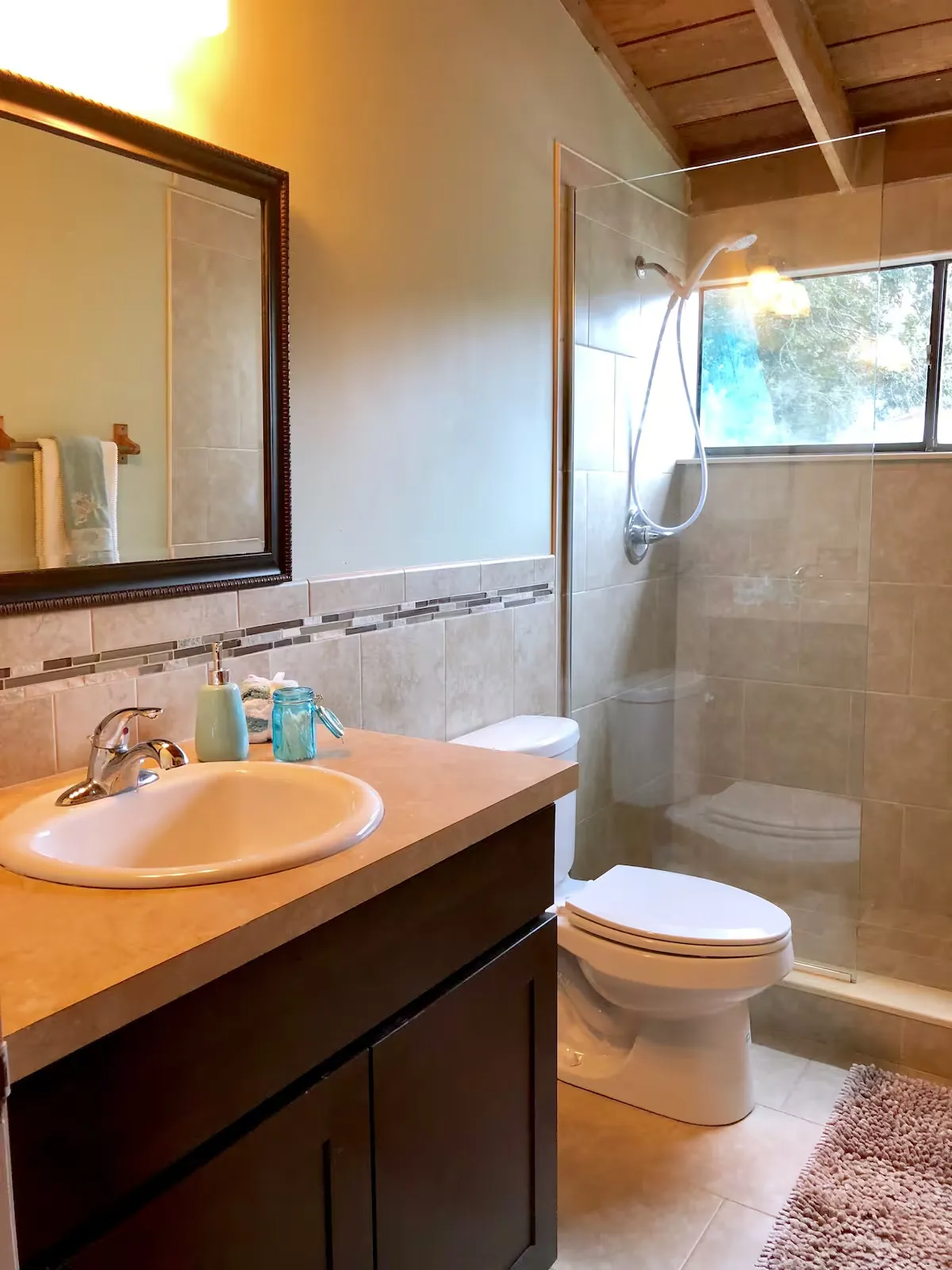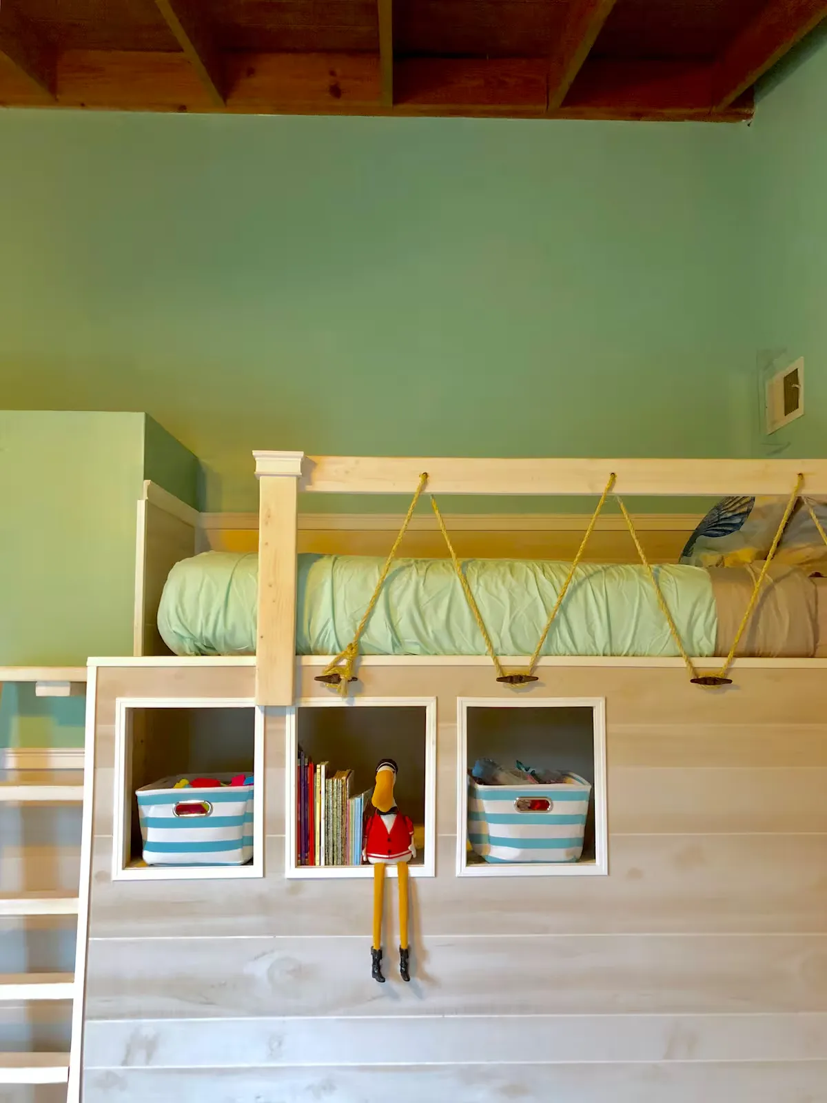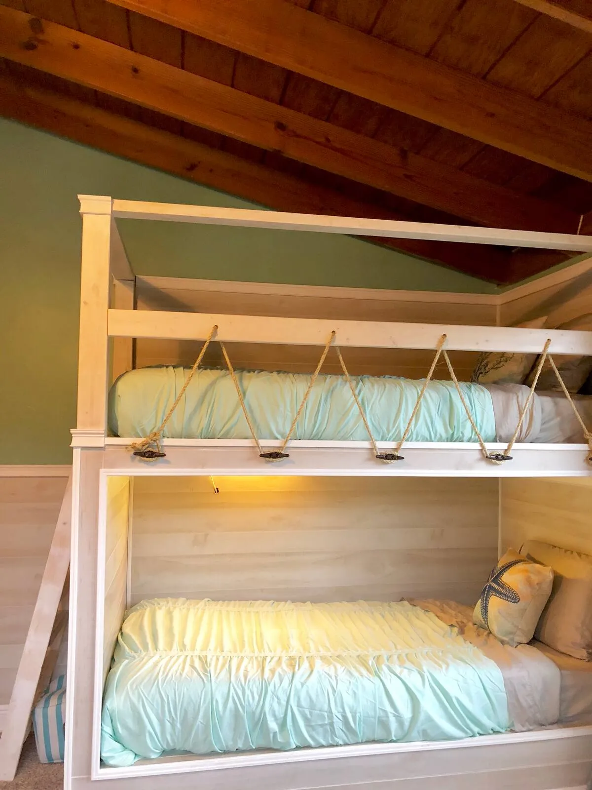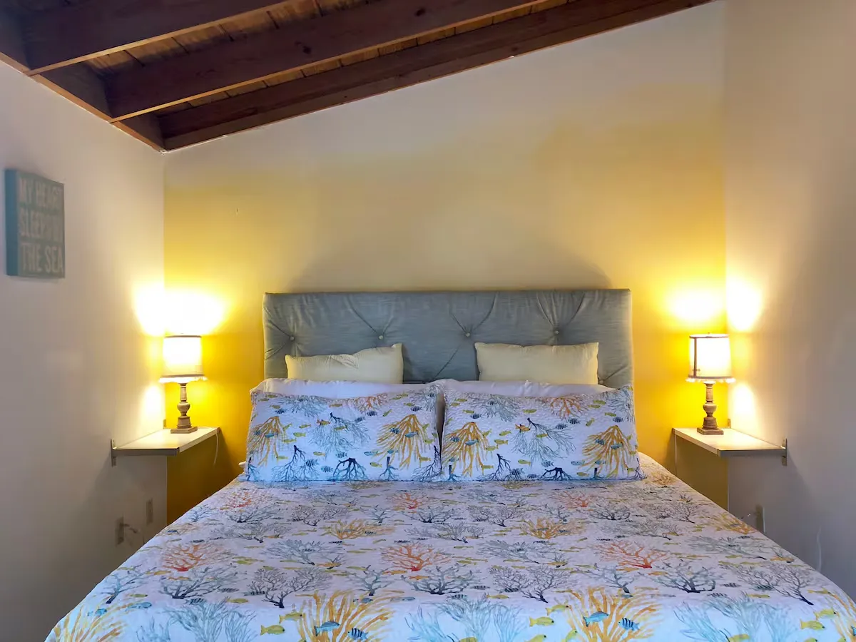 Take a stroll up the “sunrise” stairs to enjoy the main living spaces where you’ll find the master bedroom with it’s beautiful vaulted, plank ceilings, its ombre-sunrise painted wall and sliding doors that lead out to a private balcony perfect for sunset cocktails or star-gazing. Also upstairs you’ll find the newly renovated, sunlit bathroom and the second guest room that comfortably sleeps 5 and has been designed and outfitted with a built in trundle bed, a built in bunk bed and a fun loft bed.