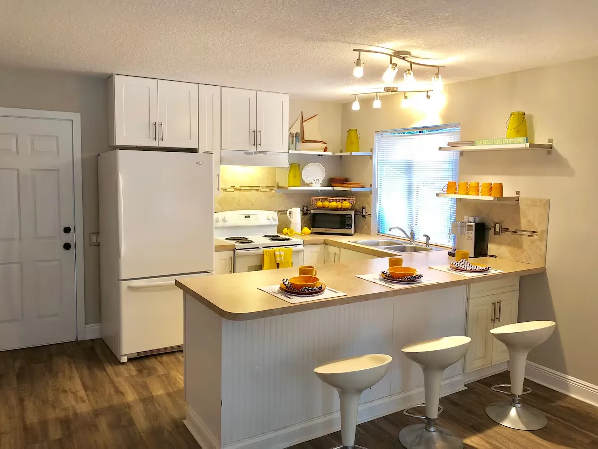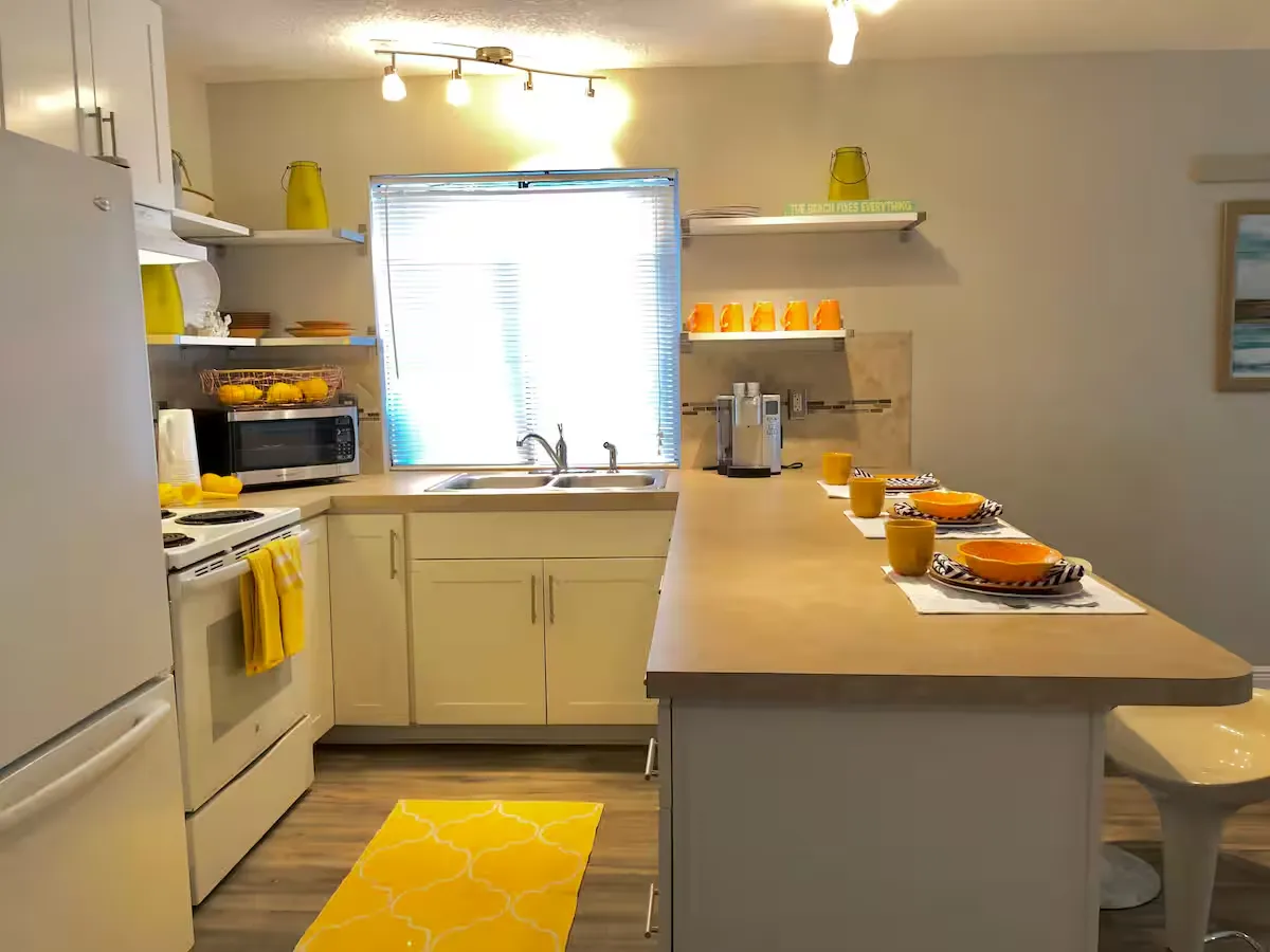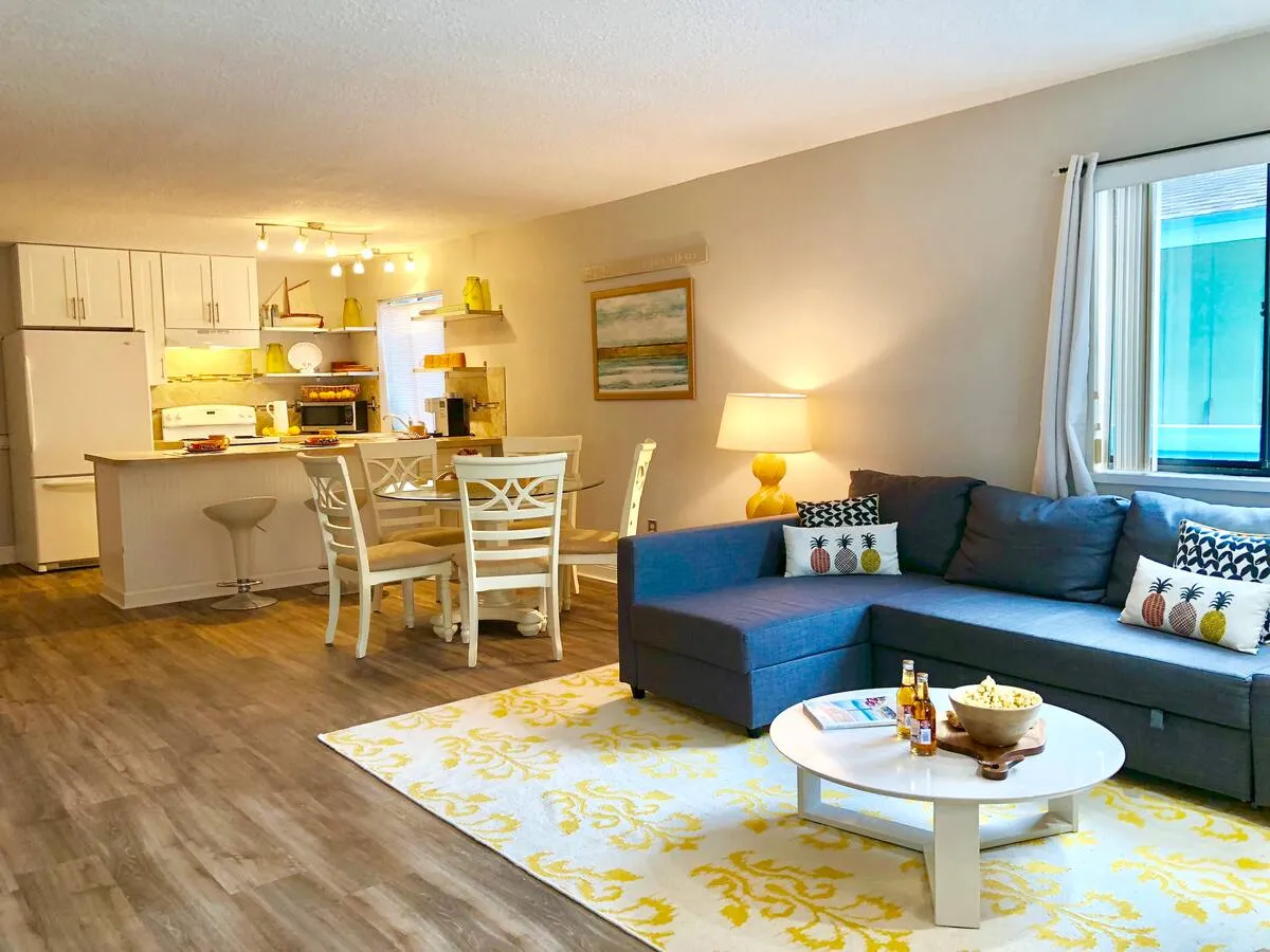 Tucked away on a quiet cul-de-sac, The Salty Pineapple provides a warm, private and relaxing total beach experience. Your home away from home, here you’ll find all the comforts of modern living while escaping the hustle and bustle of your everyday demands. Suite B welcomes you with the warmth and glow of it’s sun kissed pineapple theme. On the main floor you’ll find a modern kitchen with a breakfast bar, stylish living décor with a comfortable pull out couch and a 50 inch 4k Ultra HD Smart TV, ample seating, dining area, a laundry room and an updated half bath.