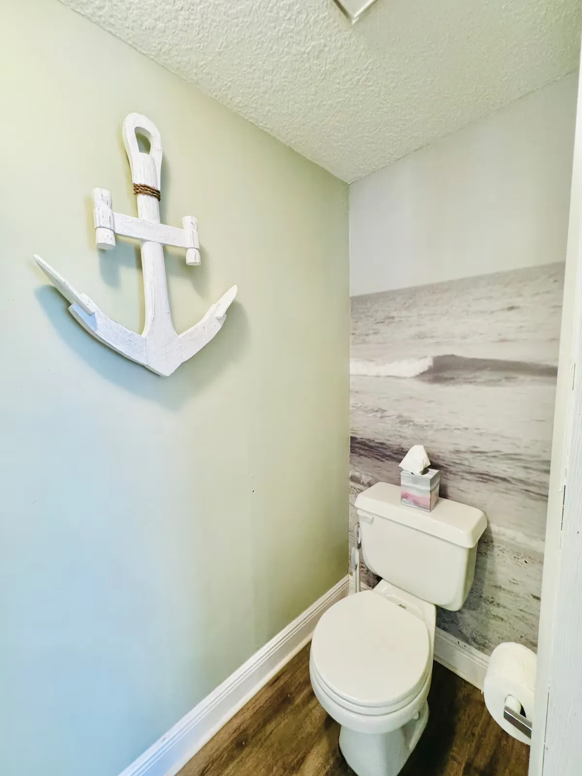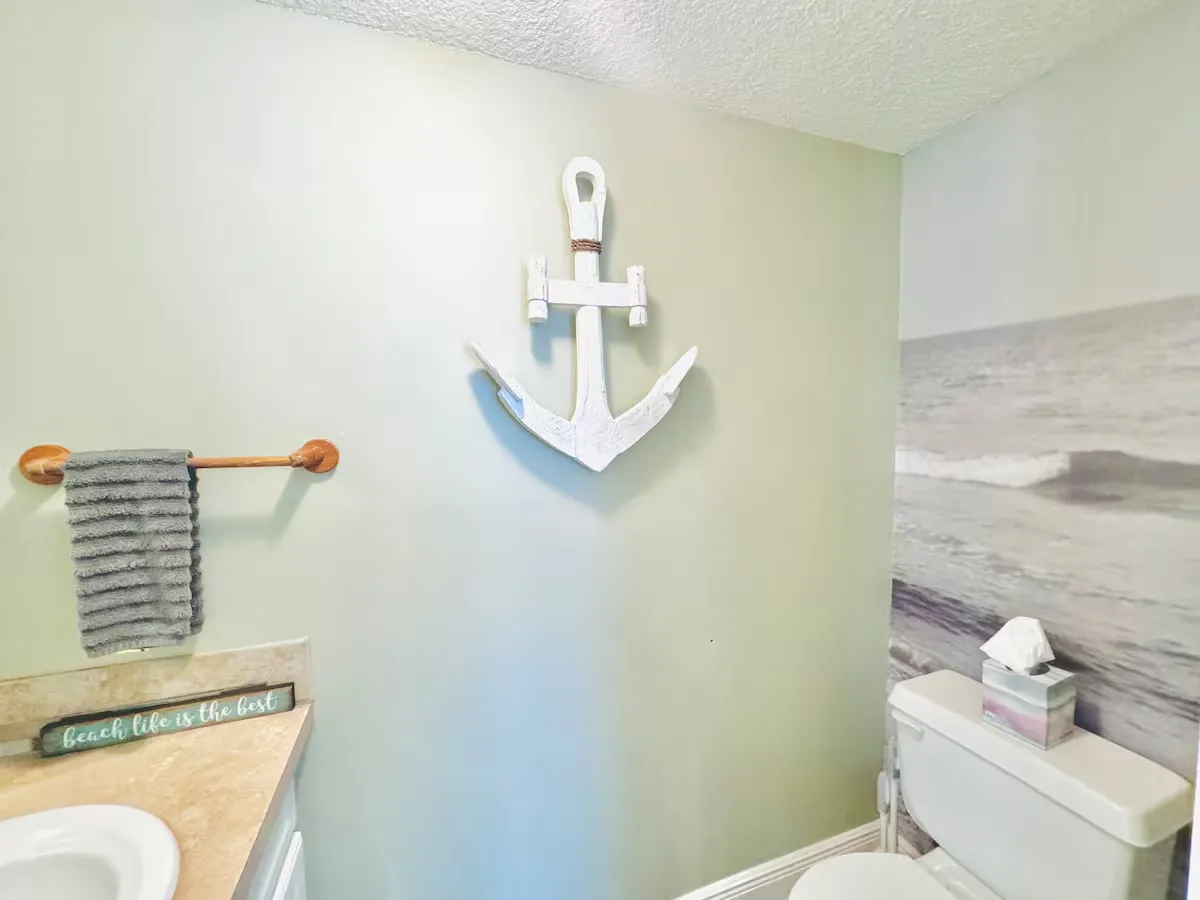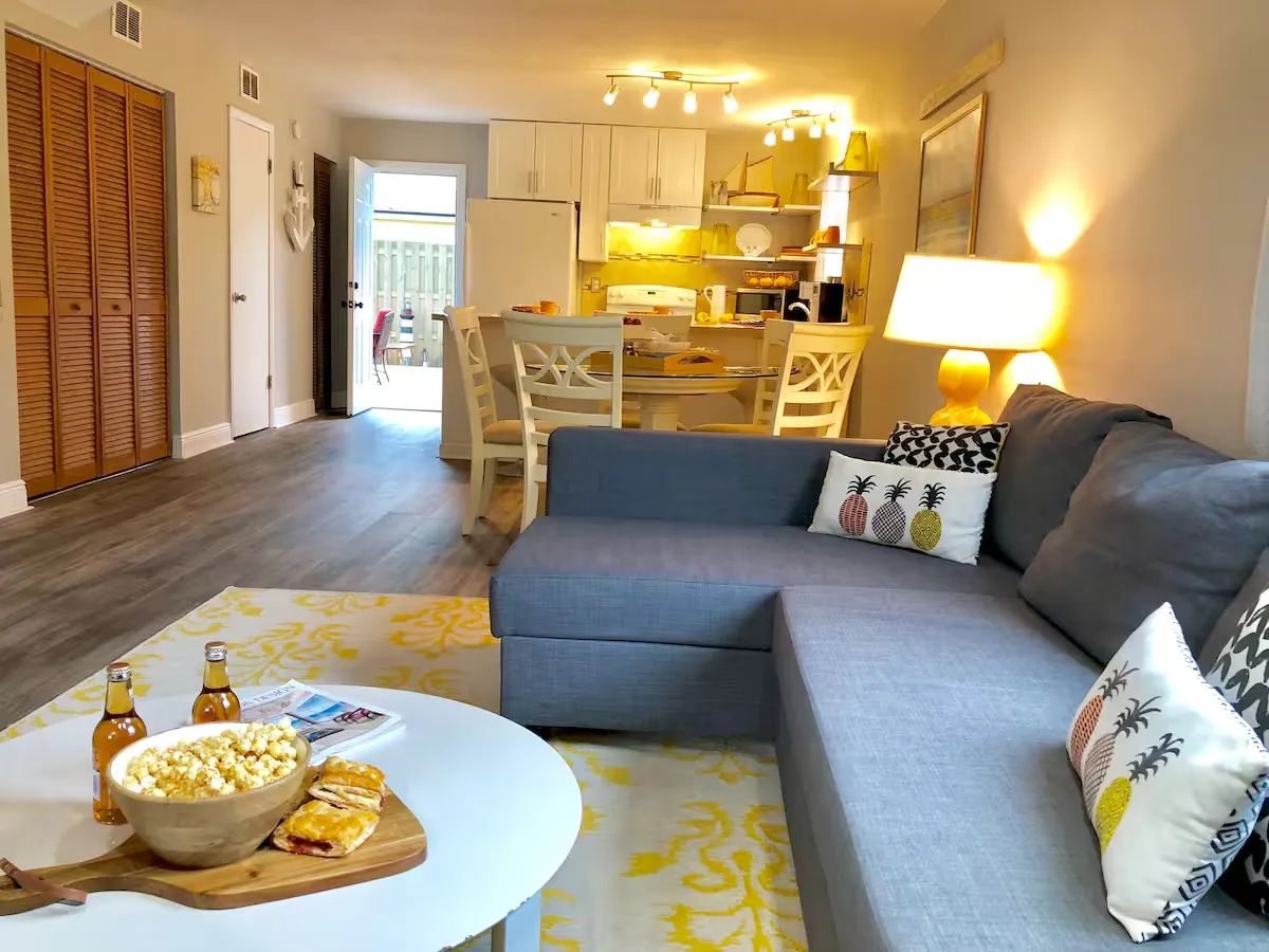 Tucked away on a quiet cul-de-sac, The Salty Pineapple provides a warm, private and relaxing total beach experience. Your home away from home, here you’ll find all the comforts of modern living while escaping the hustle and bustle of your everyday demands. Suite B welcomes you with the warmth and glow of it’s sun kissed pineapple theme. On the main floor you’ll find a modern kitchen with a breakfast bar, stylish living décor with a comfortable pull out couch and a 50 inch 4k Ultra HD Smart TV, ample seating, dining area, a laundry room and an updated half bath.