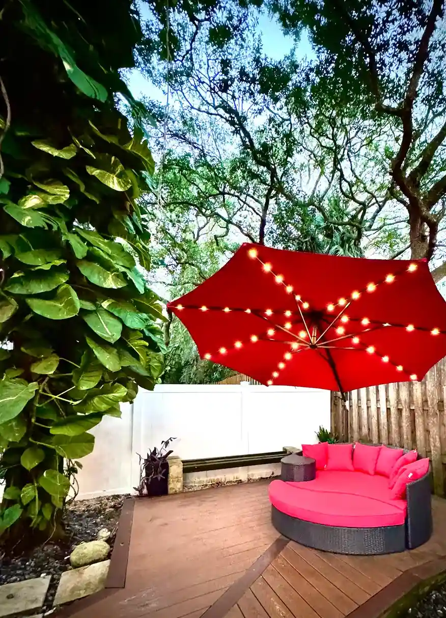 We have added a NEW retractable divider in the middle of backyard patio to allow for better social distancing/privacy between guests. The fence is a retractable screen so it’s very easy to remove or put up as needed!
